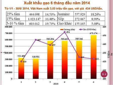 Việt Nam đã xuất khẩu được 3,003 triệu tấn gạo trong 6 tháng đầu năm 2014, giảm 14% so với 3,5 triệu tấn gạo xuất khẩu cùng kỳ năm 2013. Giá gạo xuất khẩu trung bình trong 6 tháng đầu năm đạt 432 USD/tấn (FOB), tăng 1 USD/tấn so với 431 USD/tấn cùng kỳ năm 2013.