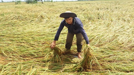 Ông Nguyễn Văn Đức nói: “Do mưa nhiều nên lúa tôi bị thiệt hại, giảm năng suất khoảng 30%. Kêu công cắt lúa đứng chỉ 140 ngàn đồng còn lúa ngã công cắt tới 250 ngàn đồng/công nên vụ này lãi rất ít”.