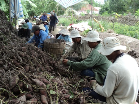 Những ngày giữa tháng 7-2012, chúng tôi có dịp đến ấp Phú Hòa, xã Phú Long, huyện Châu Thành - vùng chuyên canh khoai lang ở huyện, đi tới đâu cũng nghe người dân than thở vì khoai lang rớt giá. Năm ngoái, cảnh bà con thu hoạch khoai lang nhộn nhịp trên những cánh đồng thì nay cảnh u buồn xuất hiện nhiều trên gương mặt nông dân.