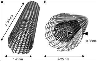 Hình 2: Mô hình sợi carbonnano một lóp(SWCNT) (A) và nhiều lớp (MWCNT) (B)cho thấy đường kính và chiều dài và khoảng cách giữa 2 lớp carbon MWCNTs.