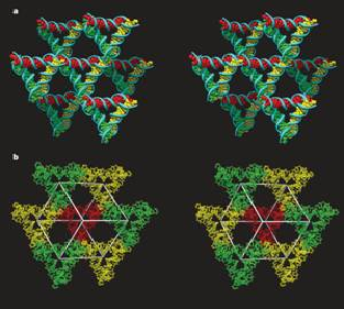 Hình 3. a. Mô hình của các tam giác liên kết với nhau; b. Mô hình của các lổ trống (đường trắng) của tam giác DNA . (Source: From molecular to macroscopic via the rational design of a self-assembled 3D DNA crystal, Nature, DOI: 10.1038/nature08274)