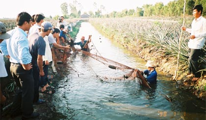 Ngoài điểm trình diễn, vào thời điểm trên có khoảng 10 hộ trong vùng thực hiện mô hình muôi cá trong mương khóm. Theo Phòng NN&PTNT, mô hình triển khai nhằm tận dụng diện tích mặt nước trong mương khóm để nuôi cá góp phần cung cấp thêm thức ăn và thu nhập cho nông dân trồng khóm.