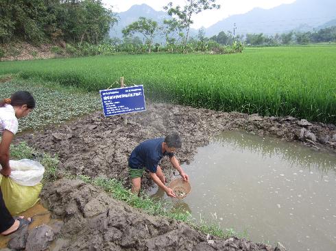 Mô hình có 4 hộ tham gia, quy mô 10.000 m2 ruộng cấy lúa; mật độ cá giống thả 0,5 con/m2 ruộng, gồm có 50% là cá chép lai V1 và 50% còn lại ghép các loài cá rô phi, trôi, mè trắng. Người nuôi được hỗ trợ tập huấn về kỹ thuật, con giống, một phần thức ăn, thuốc và một số loại chế phẩm sinh học tăng sức đề kháng phòng bệnh cho cá.