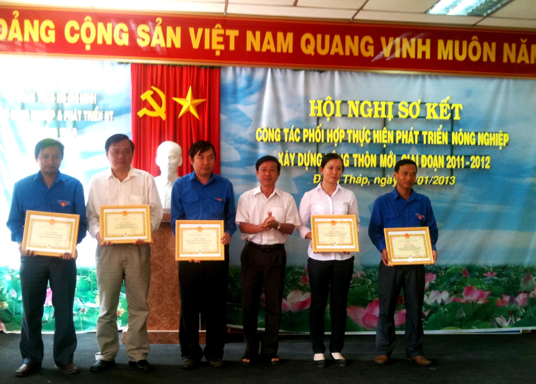 Ngoài ra, hội nghị cũng đã khen thưởng 04 tập thể (Chi cục Phát triển nông thôn, Ban Thanh niên nông thôn Tỉnh Đoàn Đồng Tháp, Ban Thường vụ Huyện Đoàn Cao Lãnh, Ban Thường vụ Huyện Đoàn Tam Nông) và 02 cá nhân (Đ/c Đỗ Văn Thương - Tổ trưởng Tổ hợp tác máy xới, xã An Hòa, huyện Tam Nông và Đ/c Nguyễn Việt Quốc - Tổ trưởng Tổ hợp tác Phun xịt, xã Mỹ Thọ, huyện Cao Lãnh) đạt thành tích xuất sắc trong tham gia công tác phát triển nông nghiệp, xây dựng nông thôn mới tỉnh Đồng Tháp giai đoạn 2011-2012.