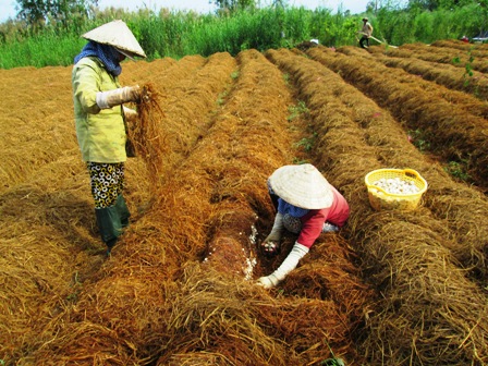 Ông Đặng Văn Miêu ngụ ấp Định Mỹ, xã Định Hòa, huyện Lai Vung cũng là một trong những người trồng nấm hiệu quả trong mùa nước nổi. Ông vừa thu hoạch dứt điểm 700 liếp nấm trồng trên mảnh đất 1.800m2, thu lời gần 20 triệu đồng. Khi hỏi về bí quyết trồng nấm hiệu quả, ông Miêu chia sẻ: “Trồng nấm, khâu đầu tiên là phải ủ rơm khoảng 11 ngày, rơm sau khi chất thành đống, tưới đều từ trên xuống, giữ ẩm liên tục cho đến khi thò tay vào thấy nóng rát là được. Sau khi ủ 4-5 ngày phải đảo rơm cho chín đều. Trong quá trình ủ thường xuyên tưới nước để rơm được rửa sạch phèn, sau đó chất thành liếp, mỗi liếp cách nhau chừng 2 tấc, rải meo thật đều trên bề mặt liếp, rồi tủ lớp rơm áo lên trên. Thời gian này phải tiếp tục tưới nước, bón phân, phun thuốc dưỡng thì cây nấm mọc lên sẽ không bị đen. Ngoài ra, trồng nấm có năng suất hay không còn phụ thuộc vào việc chọn nền đất sao cho bằng phẳng, khô ráo, tránh ngập úng, bởi cây nấm không chịu ẩm ướt. Thu hoạch xong một vụ nấm, tốt nhất là cho nền đất nghỉ, không làm ngay vụ tiếp để tránh bị thiệt hại do mầm bệnh còn tồn tại trong đất.”